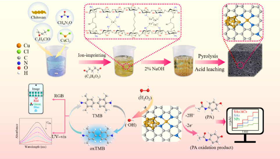 近日,公司2023级材料与化工专业硕士研究生廖辉阳以第一作者在国际知名期刊《Biosensors and Bioelectronics》上发表题为《Ion-imprinting strategy towards a novel two-in-one copper-based nanozyme for sensitive electrochemical-colorimetric dual-mode detection of paracetamol》的研究论文;公司李俊华教授为第一通讯作者,betway西汉姆联平台为第一署名单位。该研究设计并合成了一种锚定于氮掺杂壳聚糖衍生碳载体上的铜单原子/原子簇结构(CuSAs/ACs@NC),成功构建出一类具有优异电催化与类酶催化活性的新型纳米酶材料。