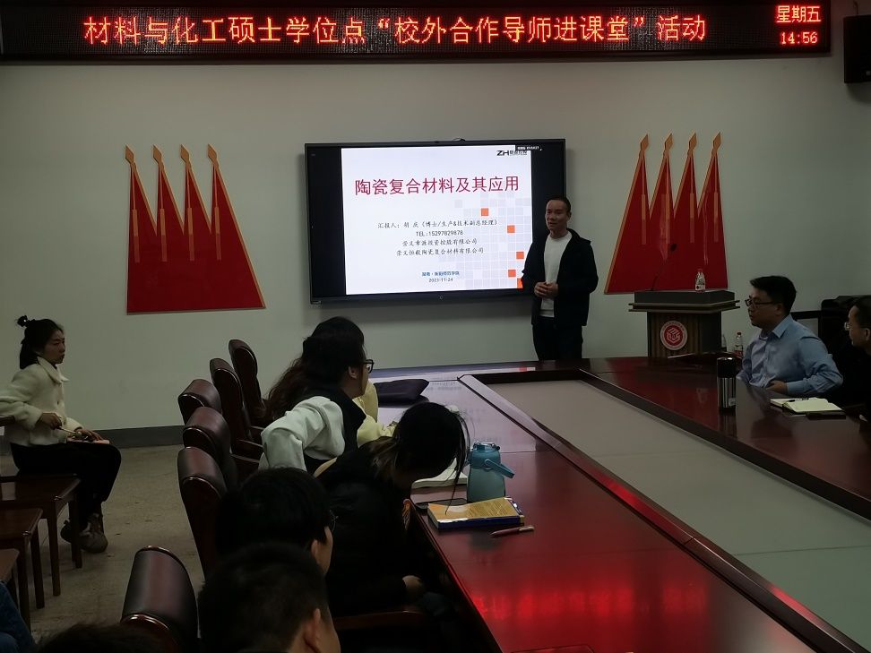 为了提高研究生的实践能力和就业竞争力,20231124日下午,公司在化学楼105会议室召开“校外合作导师进学堂”活动,此次活动邀请校外企业导师胡庆博士作学术报告,报告题目为“陶瓷复合材料及其应用”。本次活动由孙俊彬副经理主持,许志锋经理,部分老师和全体研究生参加此次活动。