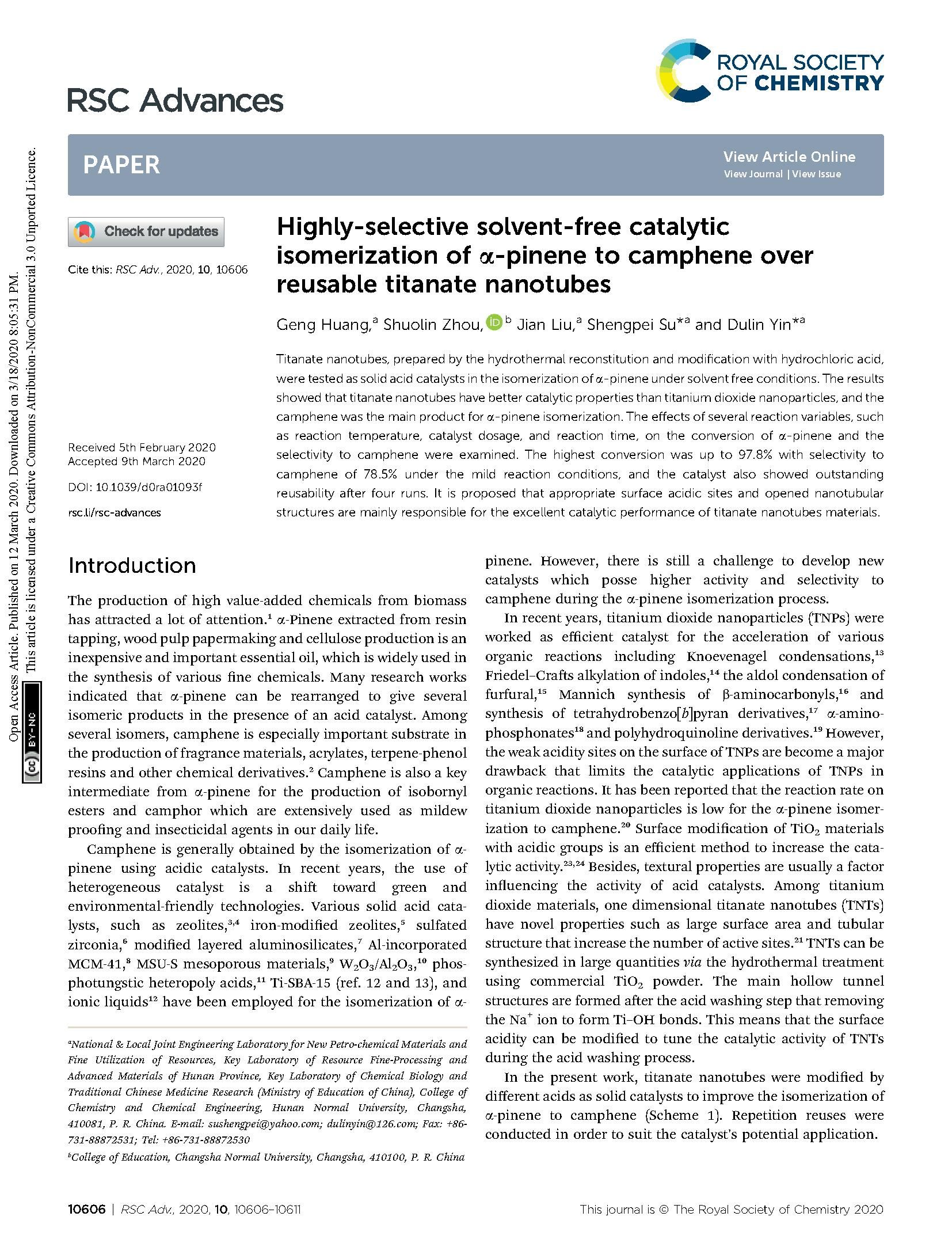 5Huang Geng, Zhou Shuo-Lin, Liu Jian, Su Sheng-Pei, Yin Du-Lin. Highly-selective Solvent-free Catalytic Isomerization of α-Pinene to Camphene over Reusable Titanate Nanotubes. RSC Advance, 2020, 10: 10606-10611.