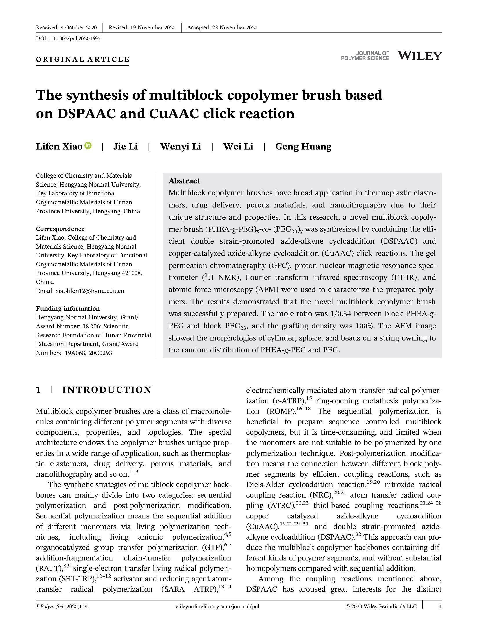 4Xiao Li-Fen, Li Jie, Li Wen-Yi, Li Wei, Huang Geng. The Synthesis of Multiblock Copolymer Brush Based on DSPAAC and CuAAC Click Reaction. Journal of Polymer Science, 2021, 59: 100-107.
