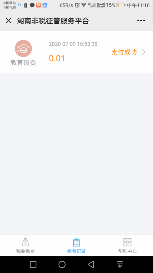 缴费成功后,用户可返回“湖南非税征管服务平台” 首页,点击底部的缴费记录,即可以查看通过平台缴费的所有记录,点击某一条记录,即可查看记录的详细信息。