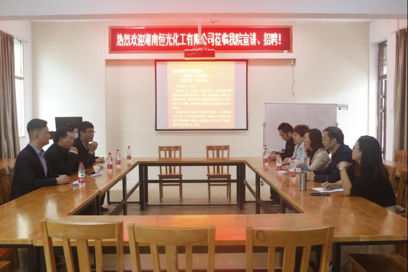 2022年4月22日下午三点,为了给员工提供就业机会,公司特邀请湖南恒光化工有限公司到校举办校园宣讲招聘活动,宣讲招聘会在成教楼405会议室进行,出席此次活动的嘉宾由湖南恒光化工有限公司总经理陈建国带队,公司党政领导刘梦琴、许志锋、曾玖红、付伟伟、李文艺全部参加,部分毕业生现场咨询、应聘。