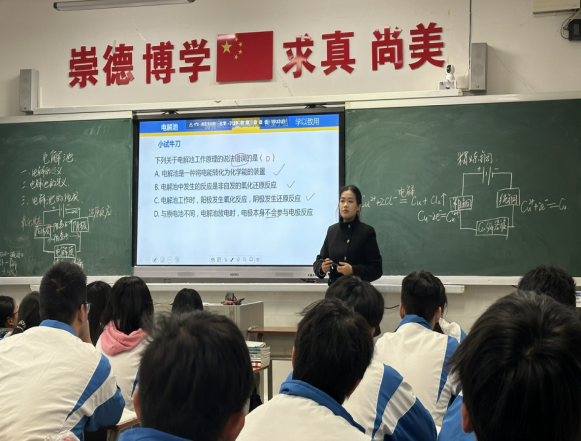 在随后的交流研讨会上,铁一中学指导教师万中幼对张雅茜的表现给予了积极评价,认为其教态自然、重点把握准确、课件简洁明了,能够完整实施“讲解—练习—总结”的教学流程,课堂互动形式多样且富有激励性。同时,万老师也提出了进一步优化的建议:一是调整知识讲解顺序,遵循“实验现象→方程式推导→反应类型判断→电极名称界定→电极连接明确”的逻辑线索;二是合理分配课堂时间,预职工思考与书写环节,通过纠错强化理解;三是注重课堂小结的设计,为后续教学做好衔接。公司实习指导教师毛芳芳肯定了实习生的教学能力与团队协作精神,强调了反复磨课对提升教学技能的重要作用,鼓励实习生在教学设计细节上继续深耕。