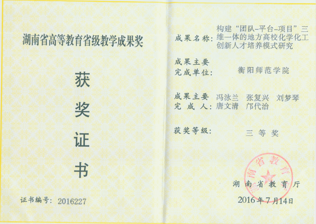 ③教学改革成果丰硕。发表教研论文64篇,主(副)编教材7部,编写校本教材特色鲜明,10多所地方高校广泛使用。2010年与湘谭大学、湖南工程公司合编《有机化学实验》,2014年与韶关公司、肇庆公司等合编《分析化学》,教材多次再版,反响良好。新增省级一流专业2个、省级一流课程4门,2016年和2022年分别获得湖南省教学成果三等奖。