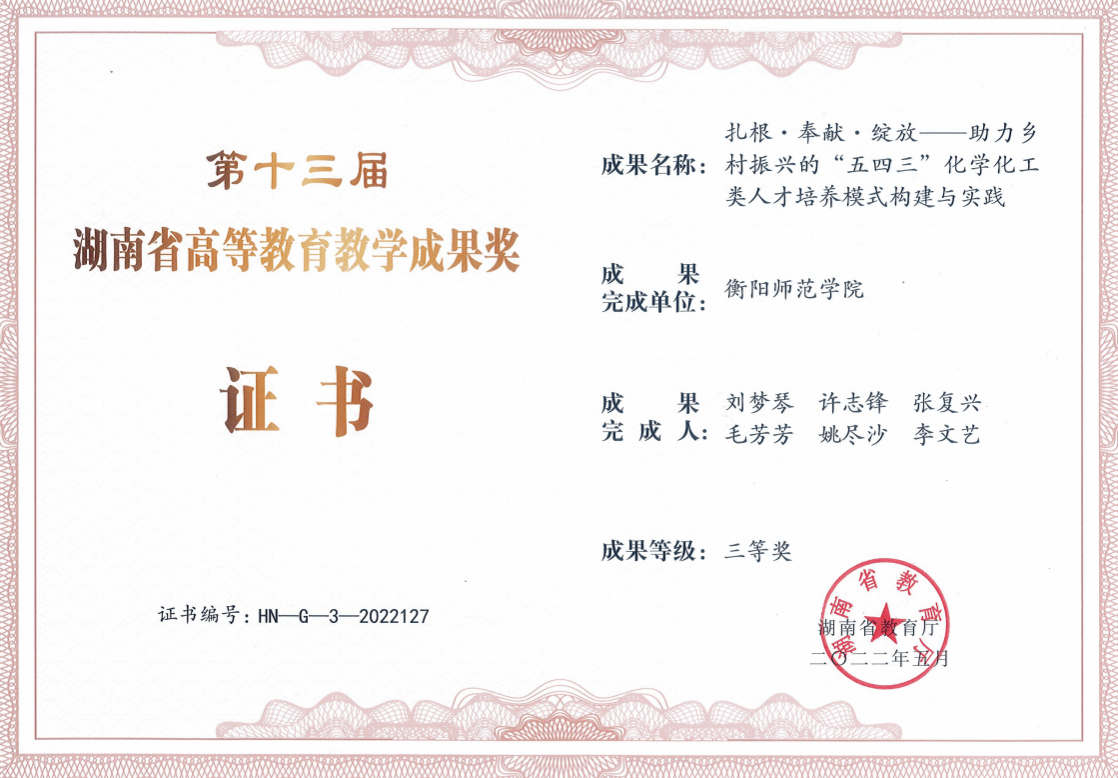 这十年,公司以培养乡村振兴化学化工类人才为目标,提升双创能力为核心,对接教育行业和化工产业,构建并实施了助力乡村振兴的“五四三”化学化工类人才培养模式,培养的人才具有“扎根乡村、奉献乡村、绽放乡村”鲜明特色,取得了系列重要成果。发表教研论文64篇,主(副)编教材7部;获湖南省教学成果奖三等奖2项;“心灵脱贫”教育帮扶团被团中央评为“全国百强传播力团队”;“湖湘红色基因寻迹团”获团中央“镜头中的三下乡”优秀视频团队;“五四三”人才培养模式在新湖南、红网等媒体上进行了宣传报道,对地方高校人才培养具有重大示范和辐射作用。