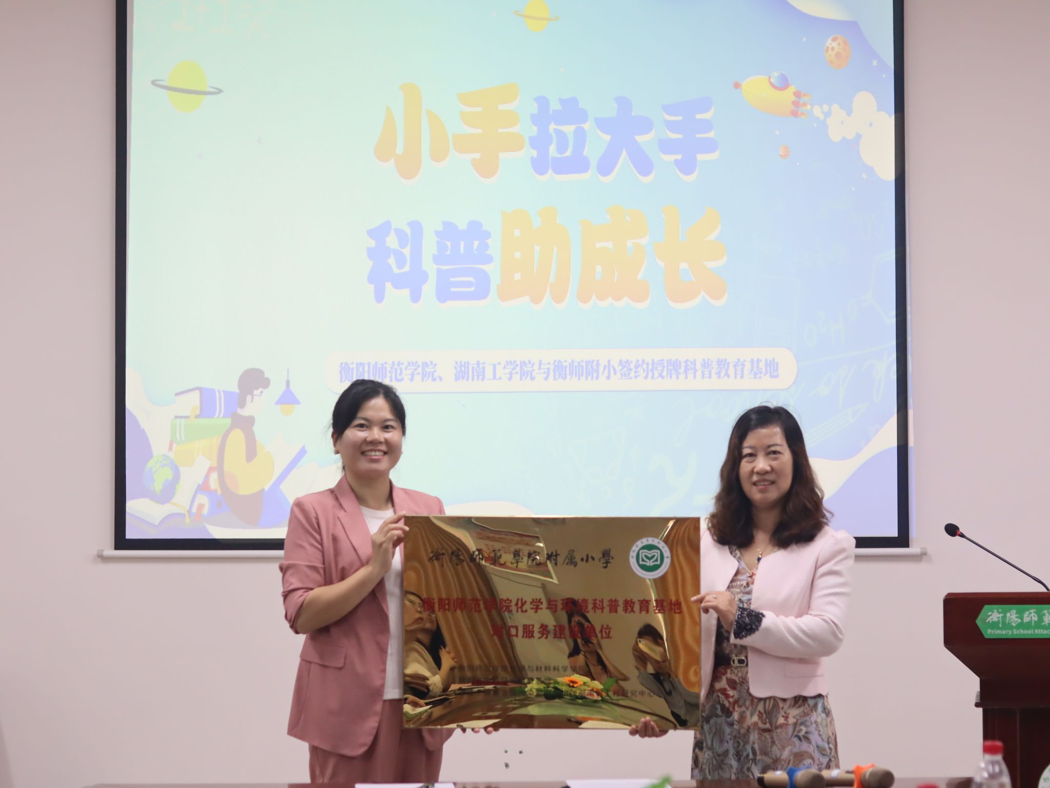 11月4日,betway西汉姆联平台与betway西汉姆联平台附属小学举行“化学与环境科普教育基地”签约授牌仪式。化学与材料科学公司党总支书记刘梦琴、副书记阳曼、副经理付伟伟以及衡师附小党总支书记、董事长邹利民、副董事长韩艳玲、罗灿、彭伟家等全体中层干部出席挂牌仪式。活动由附小副董事长韩艳玲主持。