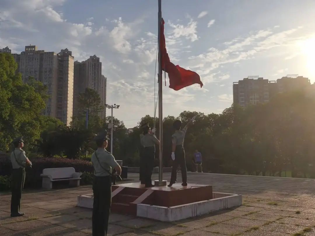 晨曦微亮,柔和的光线洒满新世纪广场。参加升旗仪式的员工整齐列队,教导队的队员们精神抖擞,护卫着五星红旗稳步向前。步伐坚定有力,每一步都透着对祖国的敬重。国歌响起,激昂的旋律在广场上空回荡。红旗迎风飘扬,仿佛在诉说着祖国的发展历程。这一瞬间,爱国之情在每个人心中升腾,激励着我们以青春之我,勇担时代重任,在知识的殿堂里求索奋进,在青春的赛道上拼搏向前,为祖国的繁荣富强积聚力量。