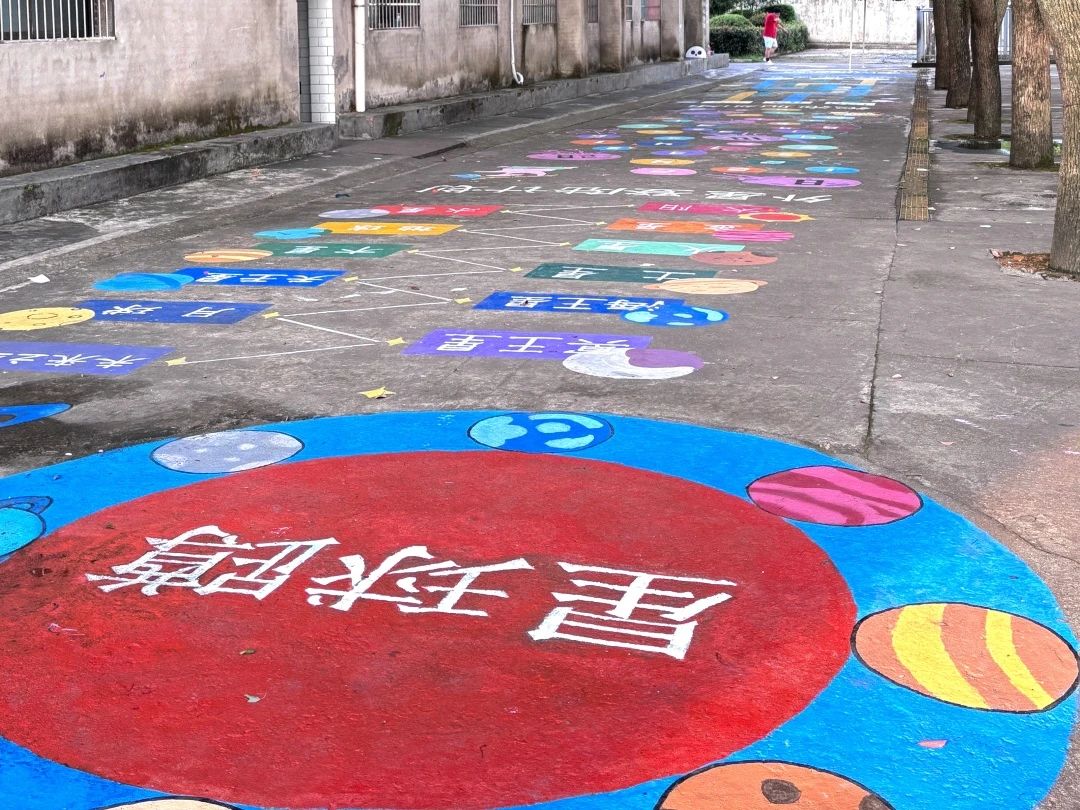 活动当天,近尾洲中心小公司园内欢笑声此起彼伏,而这满溢的欢乐离不开科普队前期细致扎实的筹备。作为筹备主力的美术组成员,早早便启动了准备工作:她们先围绕活动主题反复研讨,撰写详细策划方案,精准规划游戏区域;再根据策划内容拟定手绘手稿;随后按每日任务分工,手持五彩颜料在校园空白场地专注创作,让普通的校园场地逐步蜕变成充满童趣的快乐王国。