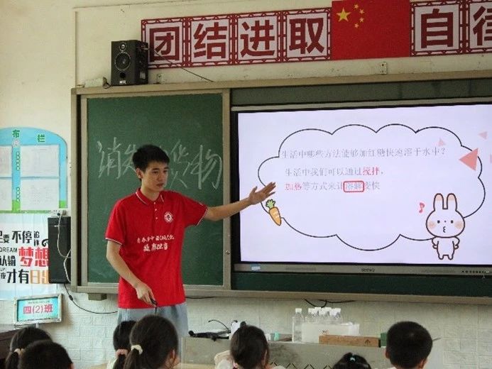 “小毛驴驮着一袋盐和一袋糖要过河,突然发现背上的货物不见了,这是为什么呢?”7月8日是betway西汉姆联平台“‘铜’心‘碳’索”科普队来到近尾洲联合公司中心小学支教的第三天,一到五年级的教室里都传来了志愿者为孩子们上科学课的声音。