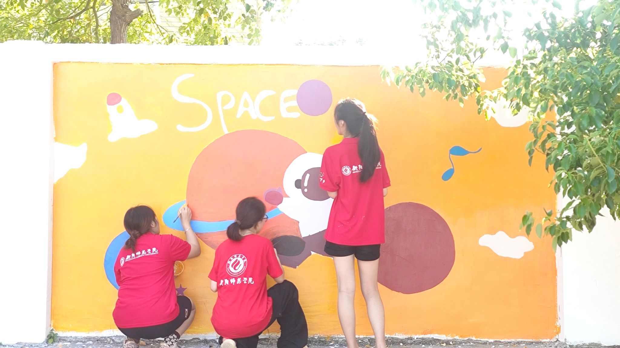 墙绘的主要负责人陈晨告诉大家,她们在唐升老师的指导下,每天早上6:00便开始工作,直到太阳晒得睁不开眼睛才停止工作,平均每天工作10小时,勾轮廓、调颜料、涂颜色,这样经过队员们7天的共同协作,才完成《科学与梦想》主题墙绘。
