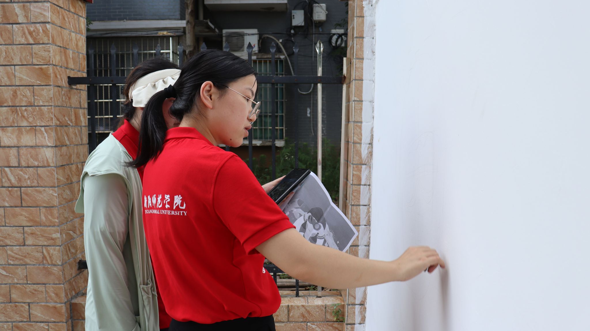 志愿者们顶着烈日专心地绘制墙画