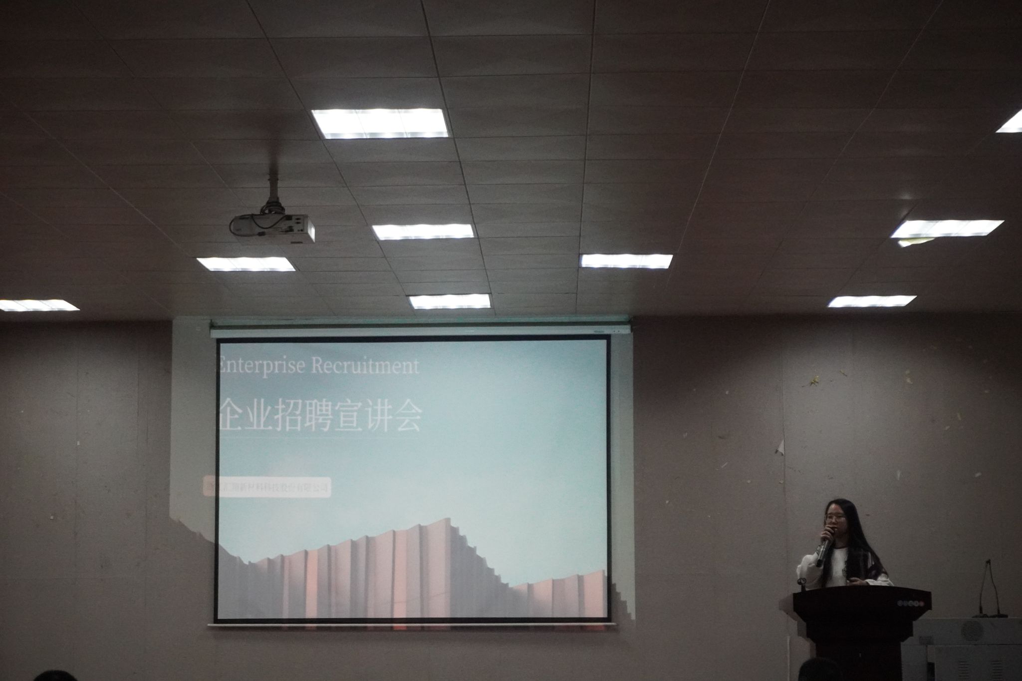 仪式第二阶段由汇翔公司人事经理明玲艳进行宣讲。她向20级和21级的员工详细介绍了浙江汇翔新材料科技股份有限公司的企业现况、企业目标、企业优势以及其招聘需求等信息,对公司有前往汇翔公司实习和就业意向的同学表示热烈欢迎。
