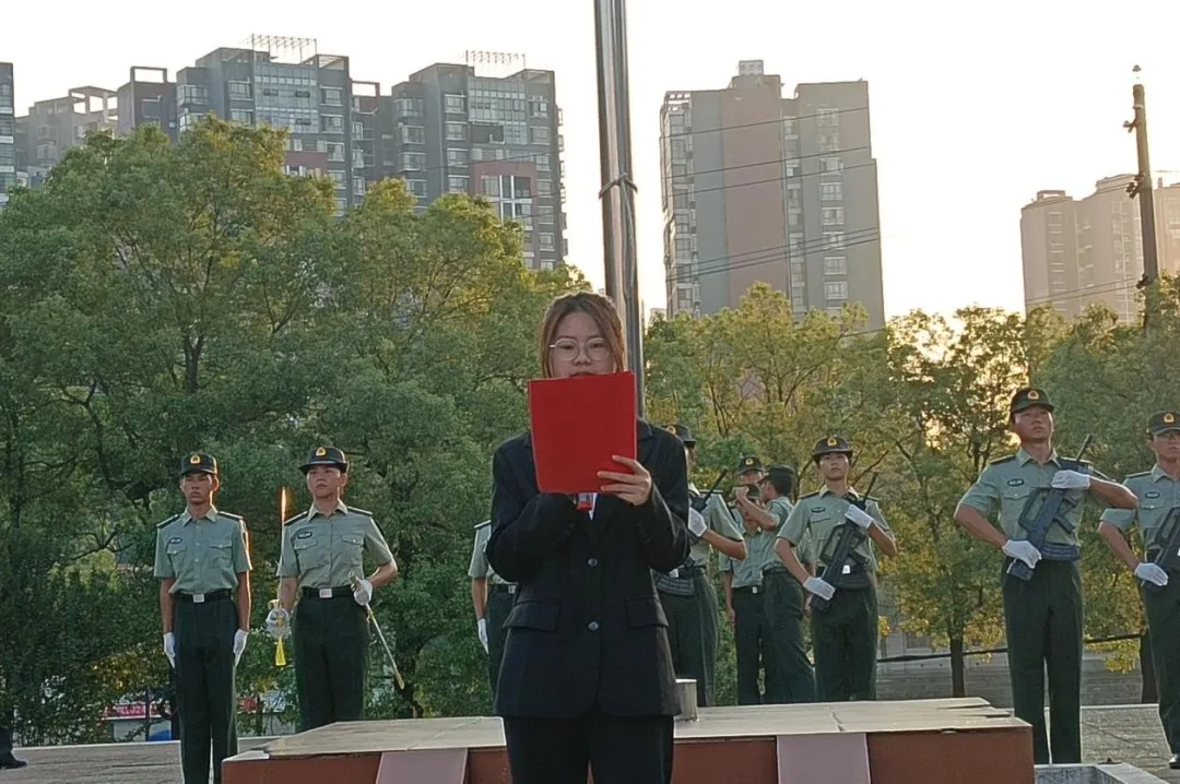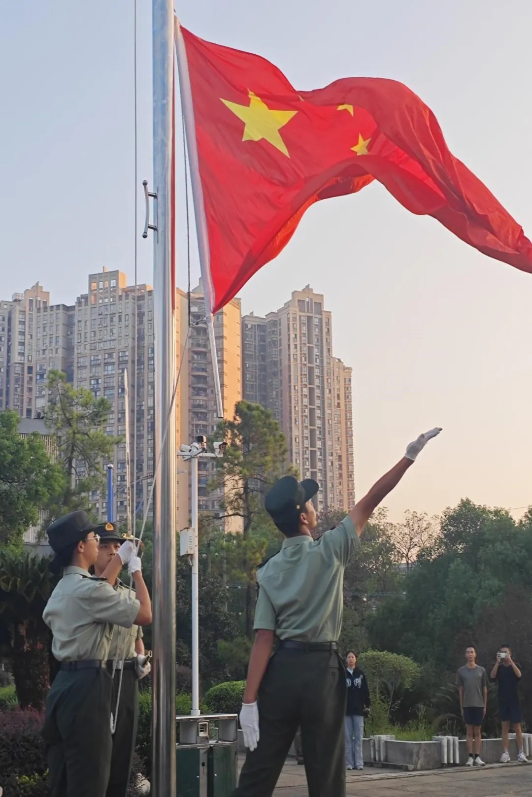 “护迎国旗!”教导队成员们以整齐划一、稳健有力的步伐步入会场,他们的眼神中透露出坚毅与决心。在同学们的热切注视下,他们庄严地将国旗护送至升旗台,彰显了对国家无尽的忠诚与热爱。国歌奏响,鲜艳的五星红旗伴随着雄壮的义勇军进行曲冉冉升起,在这庄严的时刻,全体员工肃立,齐声高唱国歌,并向国旗行注目礼,红旗沐浴着朝阳,飘扬在新世纪时代广场的上空,这一刻庄严而神圣,爱国之情在每一个同学心中澎湃激荡。