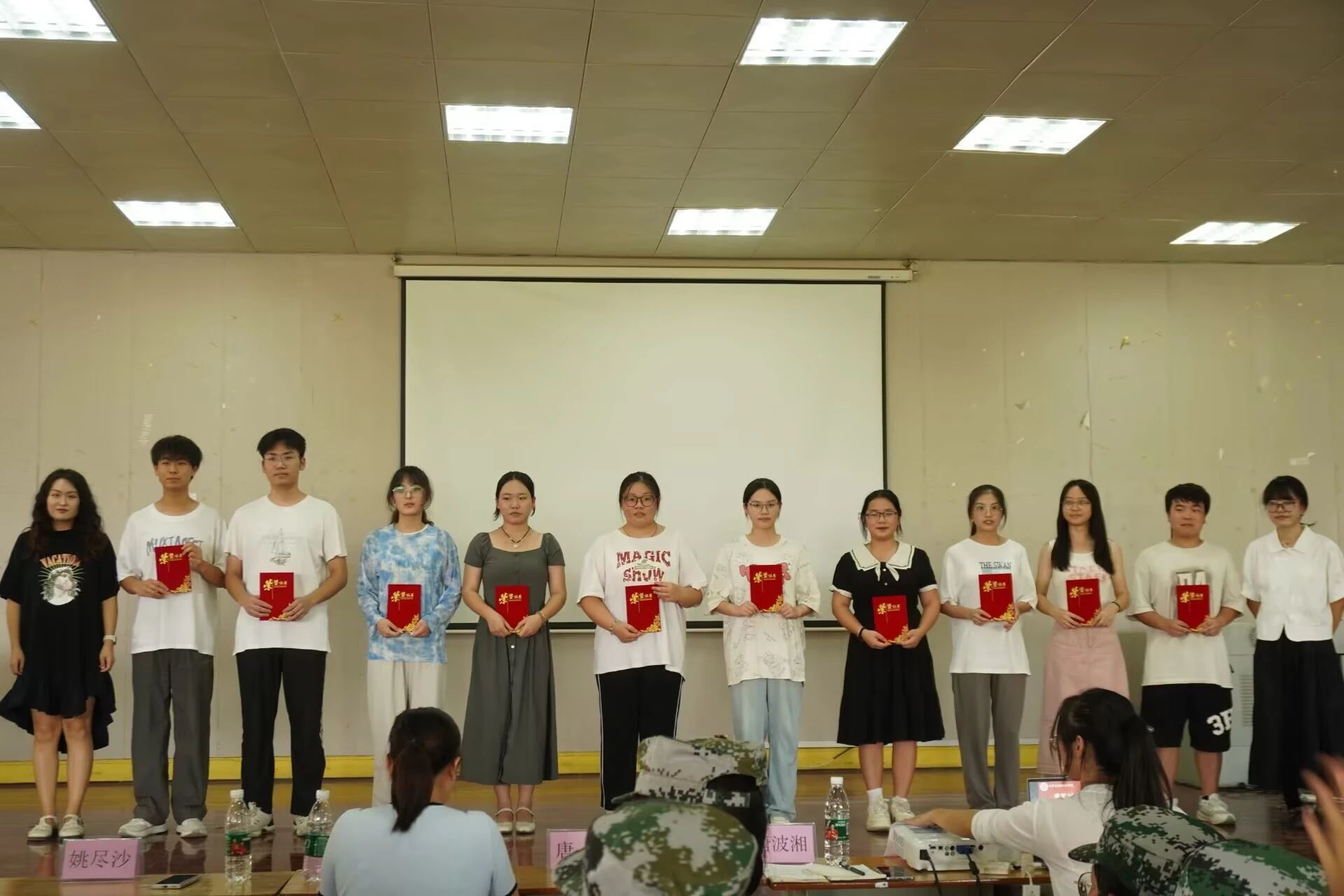 迎新与军训圆满结束离不开公司志愿者的默默奉献。他们如细雨滋润公司,传递关爱与温暖。随后,全体新生观看《志以星火,愿暖秋日》视频,记录志愿者开展清扫宿舍、引导新生报道、军训后勤保障等志愿服务的场景,深深打动了在场的师生。