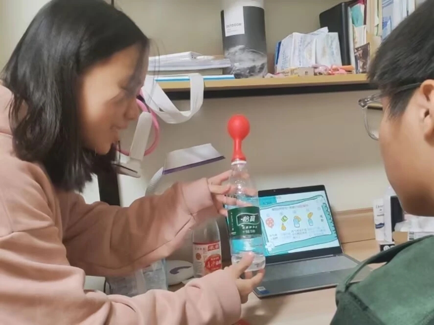 《神奇的灭火器》《谁吹灭了我的气球》《低碳生活,从我做起》等化学小实验激发了孩子们的科学兴趣,看到生活中的小苏打、醋就能发生化学反应,将气球变大,孩子们跃跃欲试。在队员们的指导下,孩子们熟练地操作一个个小实验,实验的成功让他们兴奋不已。队员们还利用腾讯会议开展趣味化学实验课,虽然与孩子们隔着屏幕,志愿者们教学的热情也丝毫不减。队员们用通俗易懂的语言解释复杂的科学知识,耐心细致地回答孩子们的疑问,孩子们也认真专注地参与到教学各个环节。